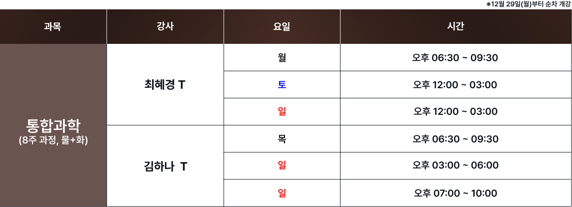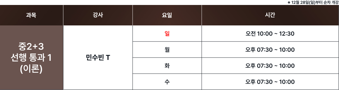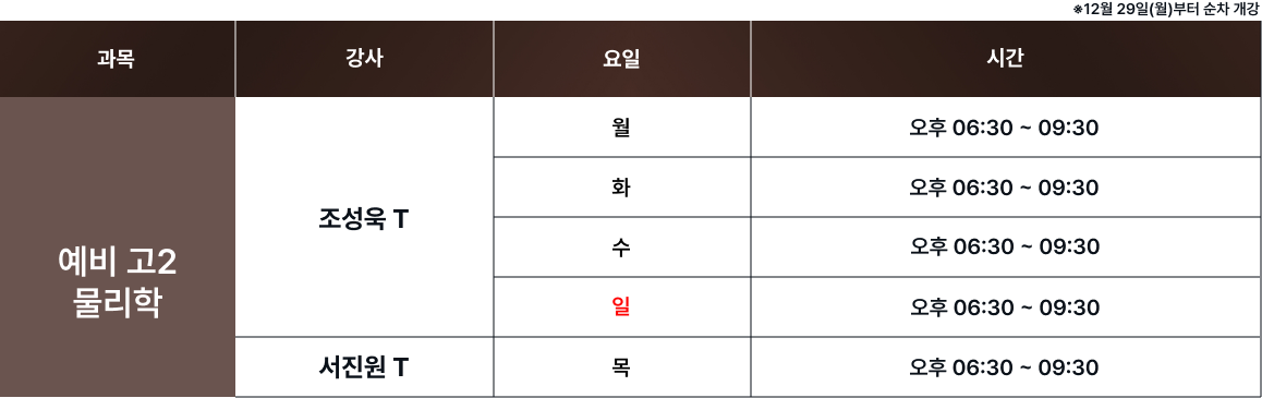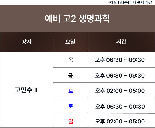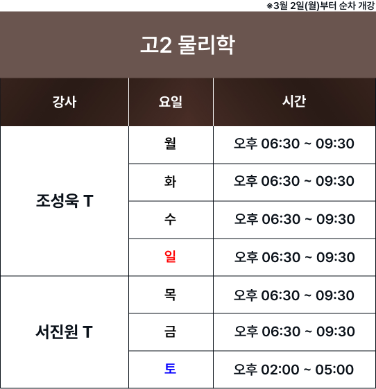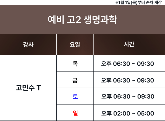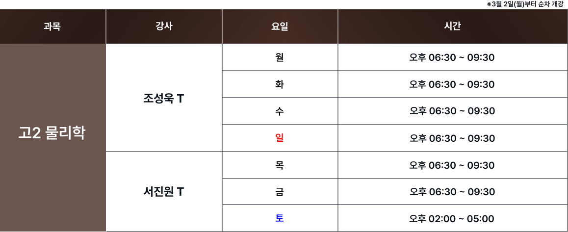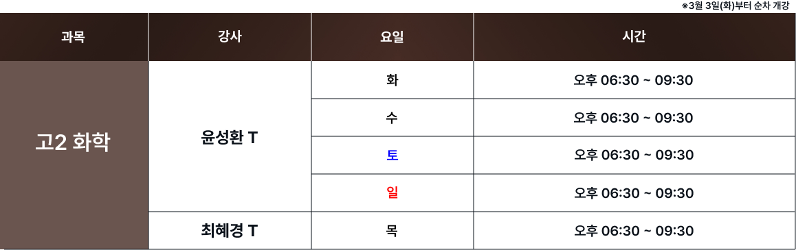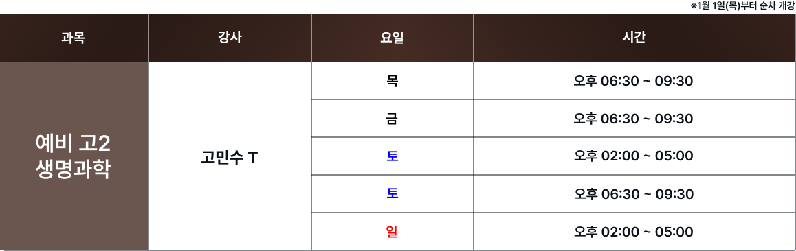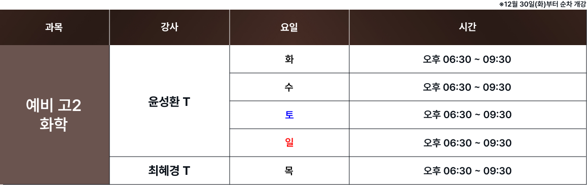 체계적인 과목별 시간표를 통해 최고의 교육을 제공합니다. 보강 및 피드백 일정은로그인 후 확인 가능합니다. 로그인 FullCalendar with Custom Colors 수업 특징 및 커리큘럼 확인하기 카톡 상담하기 전화 상담하기 네이버 카페 방문